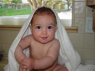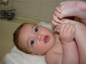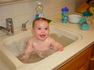 | This was still a pre-crawling shot! | It's easy to give me a bath in the kitchen sink. | |