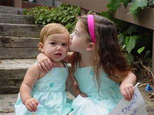 | OK, I guess I'll let her hold me. | Daddy and I like to butt heads a lot. | |