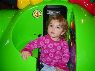 | Alex and I danced around with maracas. Party! | Now we're at Chuck E. Cheese! I love the rides. |