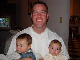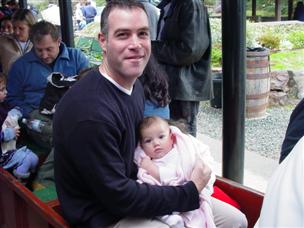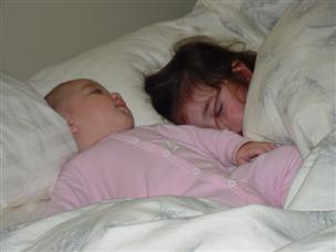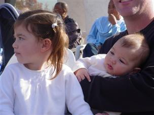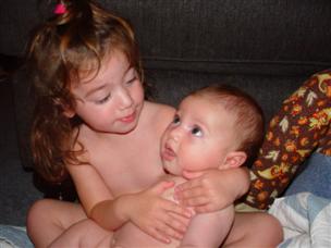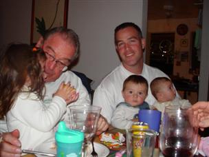 | Don't I look cute, all snuggled up? | Daddy held me and Orion at dinner. | |