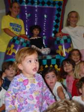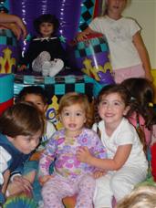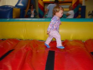 | Now we're on the bouncy thing at Paige's party! | I can run really good on it now. Watch! |