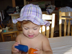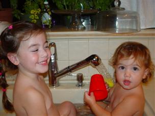 | Whew, that was a lot of playing! | Time for a bath with Alex in the sink! |