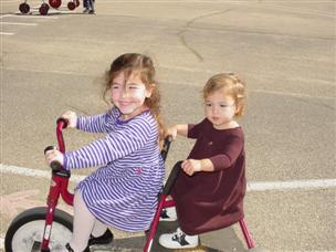 | Nina came and joined us before going to Alex's school. | I rode the bike with Alex once we got there. |