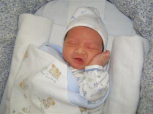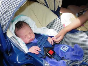 | .Chase's first car ride (note how he's holding Alex's finger) | Now we're home, safe and sound! |