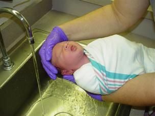 | Here's Chase holding Mommy's thumb (Daddy was off playing football). | Time for his first bath! |